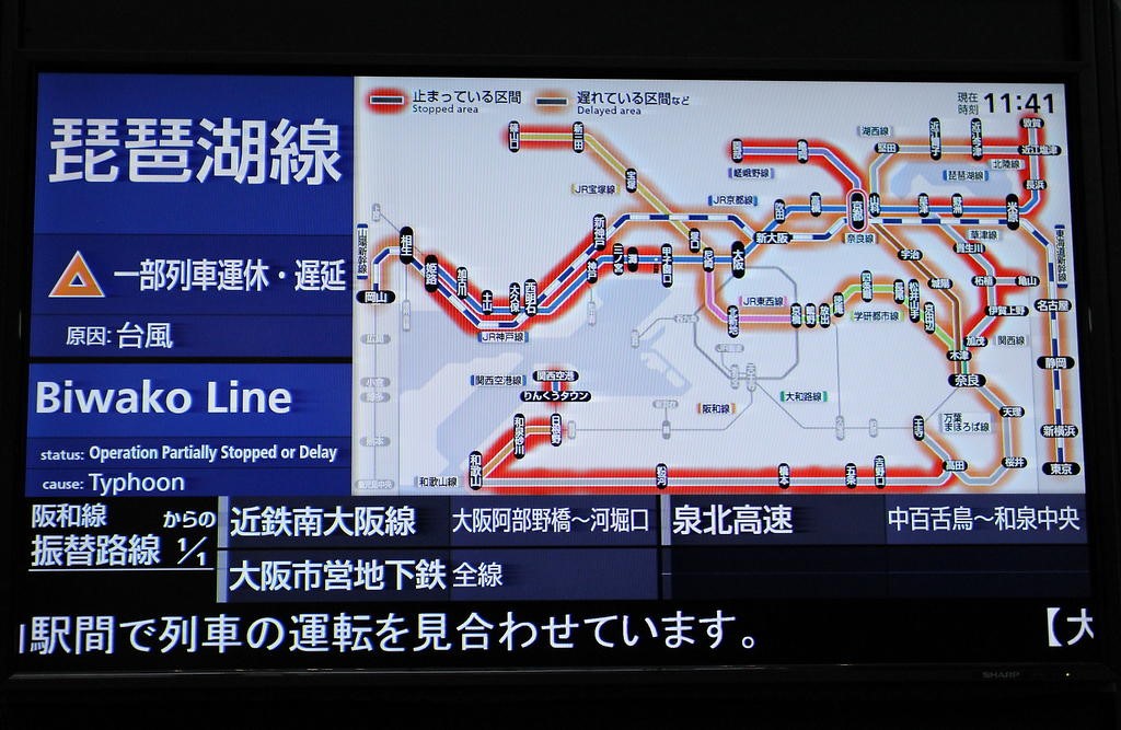 Vlaky dlouho hrdinně odolávaly rozmarům počasí a stále jezdily. Brzy ale u některých tratí začaly na tabulích naskakovat informace o zpožděních. Co mne zaujalo, že zpoždění se zobrazovalo jen u lokálních tratí. U šinkansenů, přestože ve skutečnosti většina spojů zpoždění měla, se žádné zpoždění neuvádělo. Jen čas pravidelného odjezdu, který byl už třeba hodinu starý. Fronty cestujících u pokladen a informačních překážek postupně rostly, vše dirigovali policisté se speciálními protidešťovými návleky na plackách svých čepic.